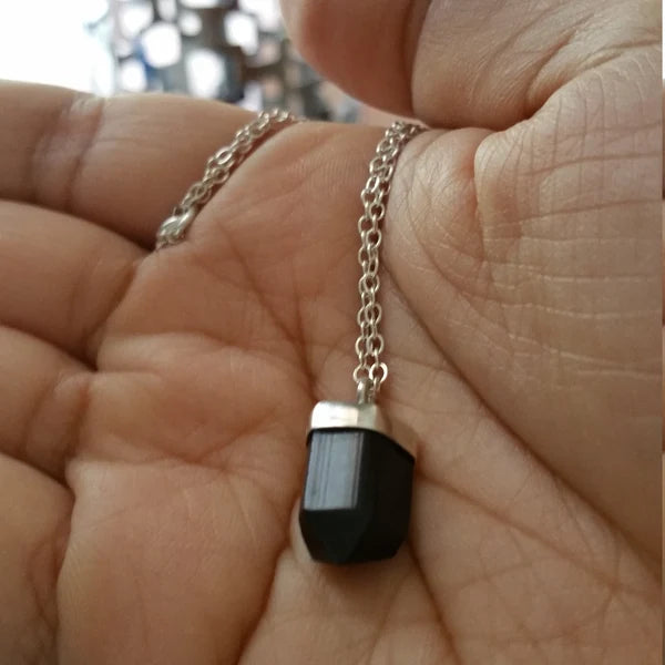 The black Tourmaline pendant is one of my favorite pieces to date. The silver is nicely finished and the rough cut of the nugget stone gives it a nice contrast and organic feel. The size is also perfect. It's not too subtle, yet not gargantuan against my petite size.