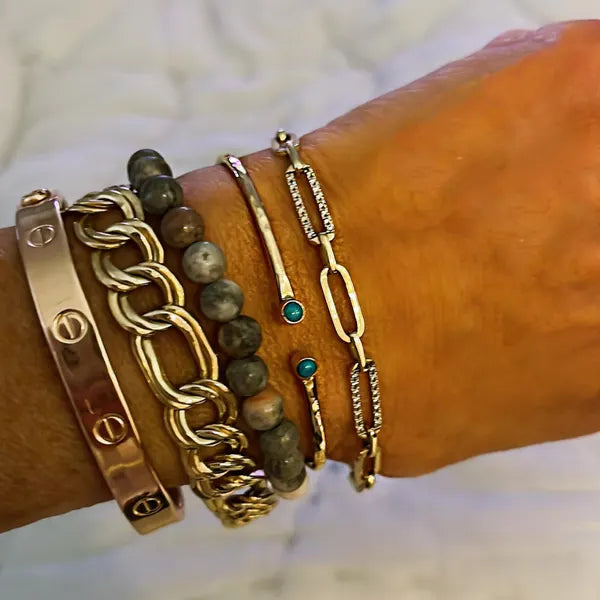 This bracelet is really nice. The hammered gold shimmers beautifully and the stone (turquoise) adds a touch of color. I also feel this was a fair price for 14k gold! This item very much met my expectations. Highly recommend!